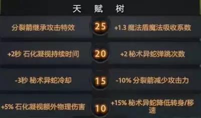 天赋选两右两左的顺序(先右、再右、接着左、最后左):秘术异蛇降低目标转身速度和移速的效果提了15%;分裂箭的攻击力会少10%;石化凝视能多持续2秒;还有分裂箭能继承攻击特效。