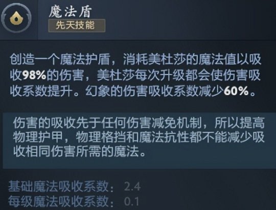 魔法盾是美杜莎的技能,能生成一层魔法护盾——得靠消耗她的蓝量来抵消98%受到的伤害。而且美杜莎每升一级,这层护盾的伤害吸收比例还会跟着提高。不过要是她的幻象用这个技能,吸收比例得少六成。