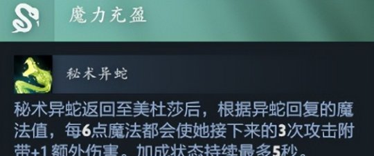 左边的效果是这样的:当秘术异蛇携着满溢的魔力回到美杜莎身边时,根据这条蛇带回来的魔法量,每凑够6点魔法,她接下来的三次攻击都会多出1点额外伤害——这种增益最多能持续5秒。
