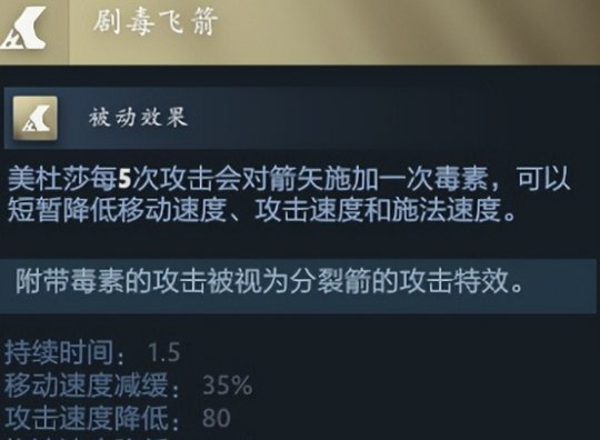 美杜莎每攻击5次,射出的箭矢就会附上一层毒素,能在短时间里让目标的移动、攻击和施法速度都慢下来。